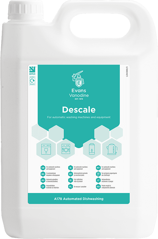 Evans Descale For Automatic Machines and Equipment is a concentrated acid based liquid for descaling industrial automatic dish & glasswash machines. Suitable for removing limescale from a variety of kitchen equipment.