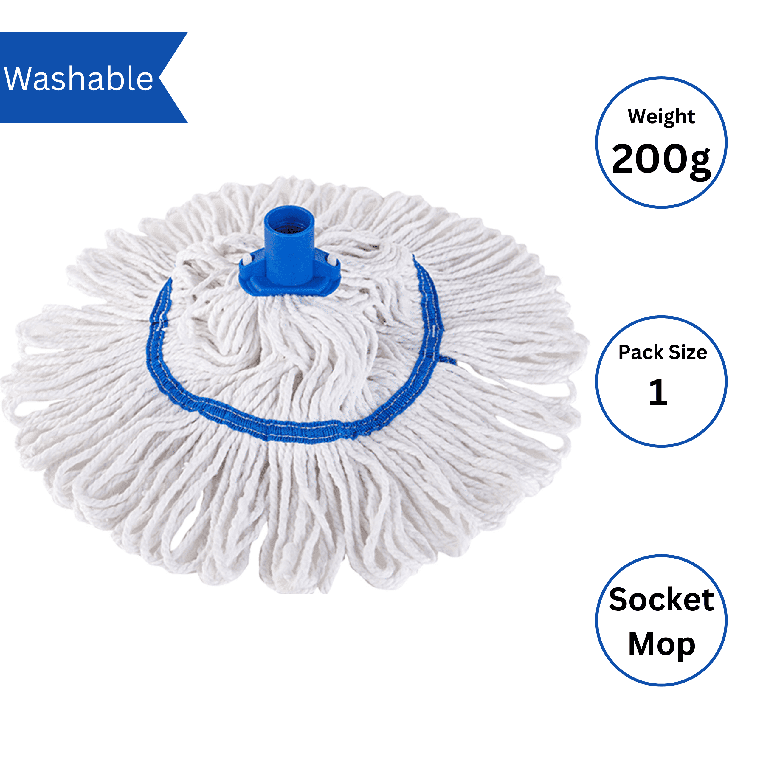 "A circular mop head with a T1 screw thread socket. The stayflat band holds the circular shape enabling the mop to cover a larger floor area, whilst the looped end yarn prevents linting and the yarn tangling is use. Made from a unique blend of polyester and cotton yarns for improved strength and absorbency. Available in various weights and colous.