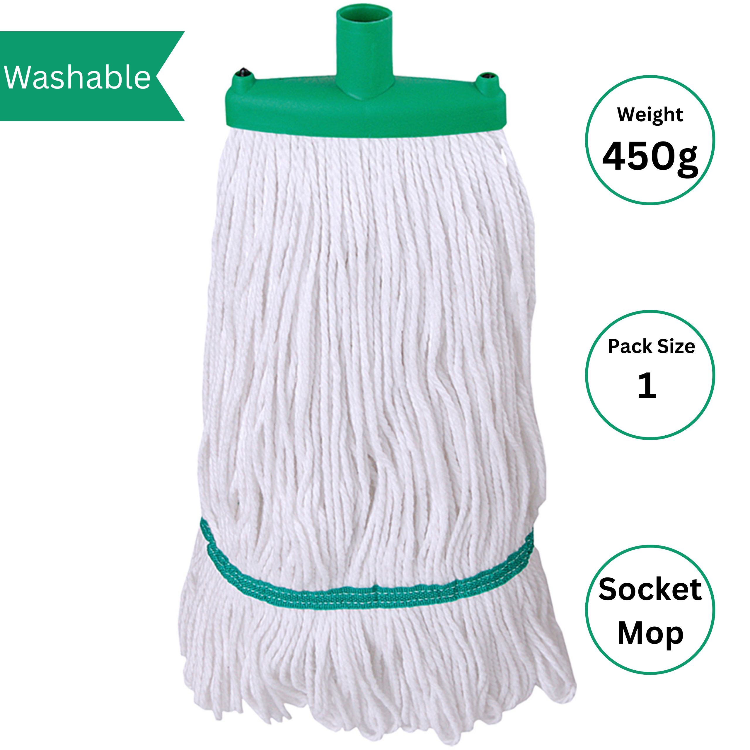 "Hardwearing mop made from a unique blend of bleached cotton and synthetic yarns, with a screw thread fitting attached to avoid user contact when changing heads. The stayflat band keeps the yarn flat on the surface covering a larger area, whilst the looped end yarn prevents tangling.