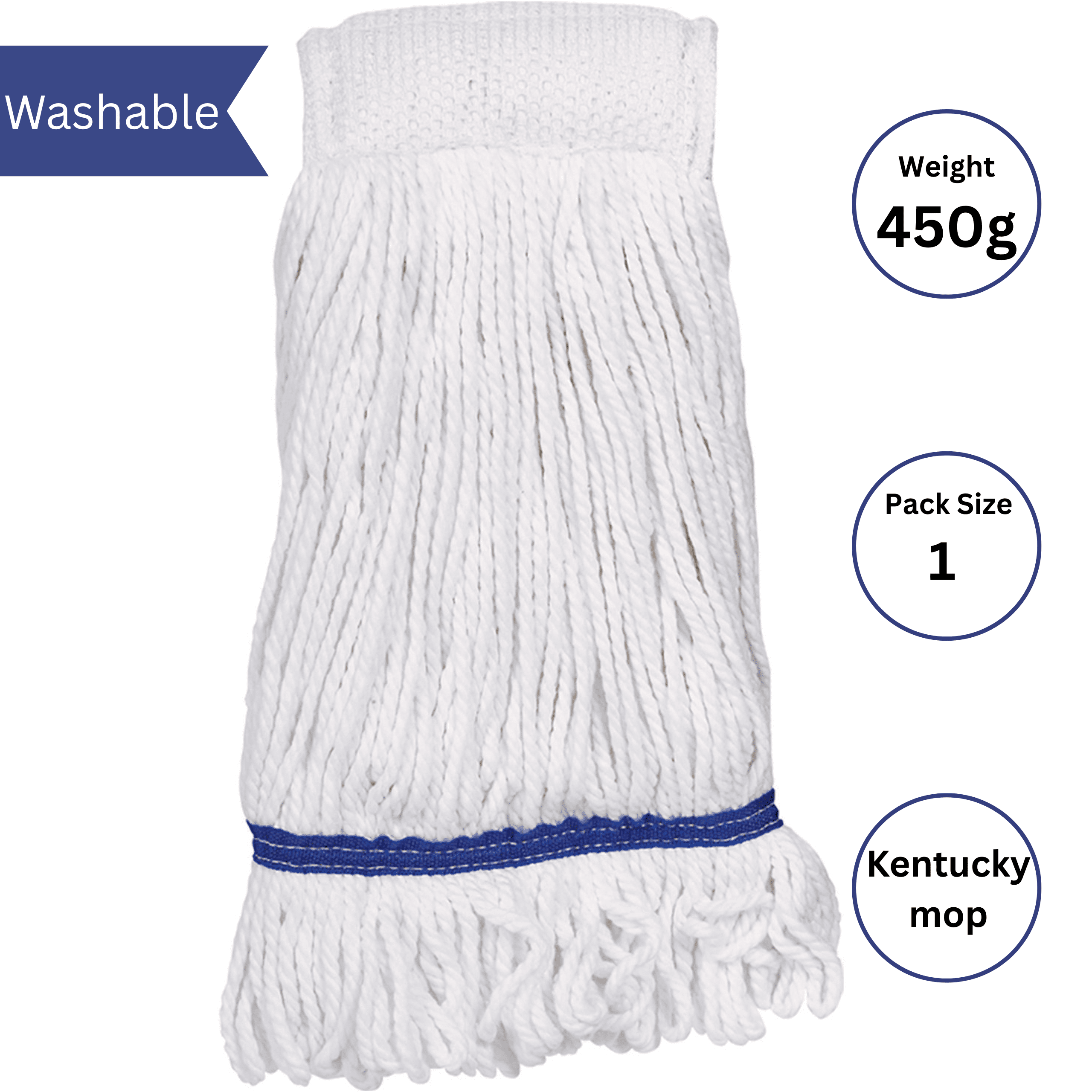 "PY, Twine and Hygiemix yarn kentucky mops with an abrasive scratchback centre band for removing dirt whilst mopping. The stayflat band keeps the yarn flat on the floor, enabling the mop to cover a larger floor area, whilst the looped end yarn reduces linting and avoids the yarn tangling in use. White colour scratchback is standard, and also available with coloured scratchback.