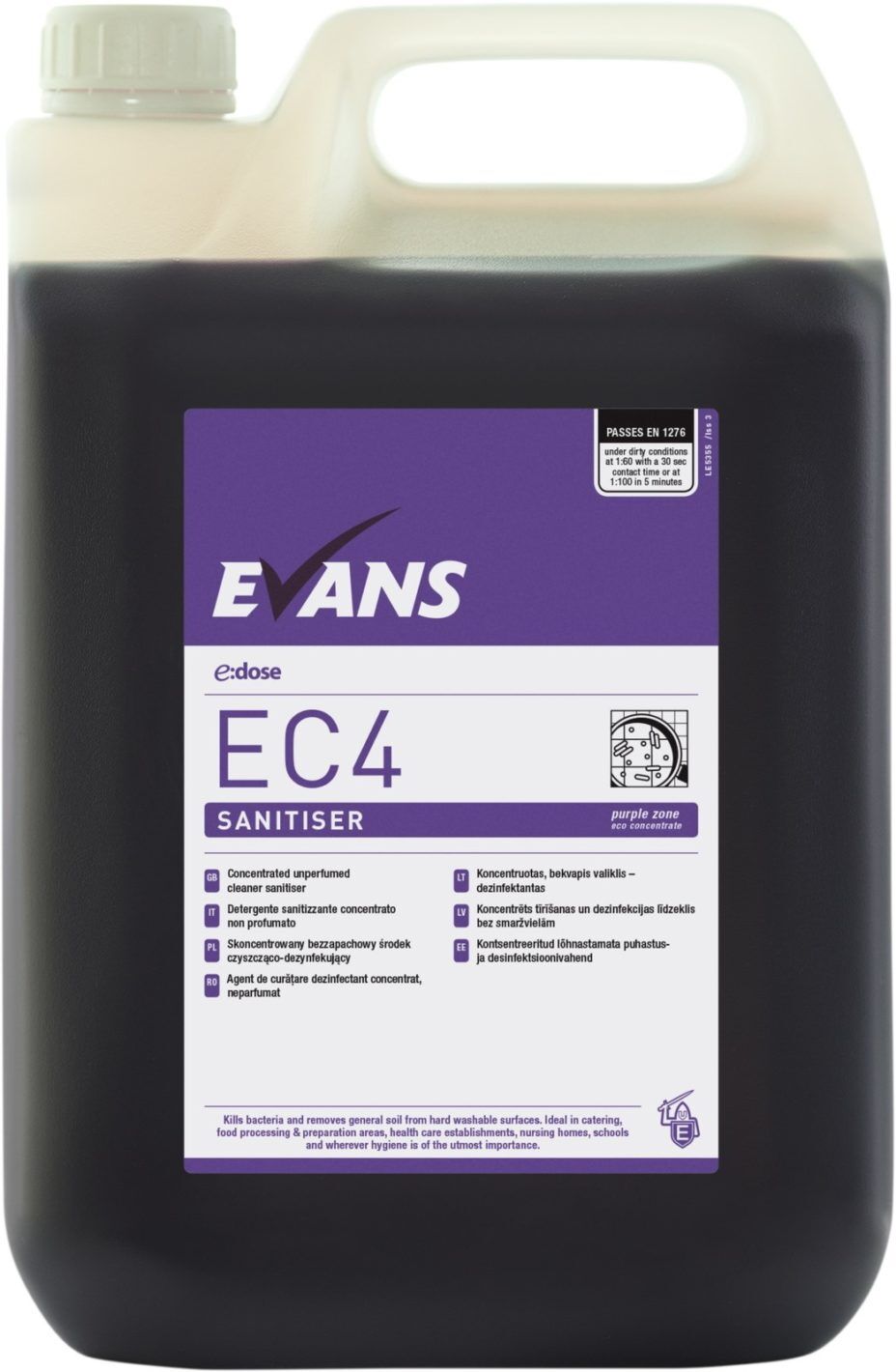 Evans Purple Zone EC4 Eco Sanitiser is a super concentrated sanitiser and multi surface unperfumed cleaner and disinfectant. Ideal for use in the food industry, nursing homes, schools and wherever hygiene is of the utmost importance. EC4 removes general soiling and kills bacteria in one operation, whilst helping to prevent the spread of contamination making it ideal for use on worktops, chopping boards, tables, refrigerators and other kitchen equipment. EC4 Sanitiser kills bacteria and passes EN1276 under dirty conditions at a rate of 1:60 with a 30 second contact time or a rate of 1:100 with a 5 minute contact time.