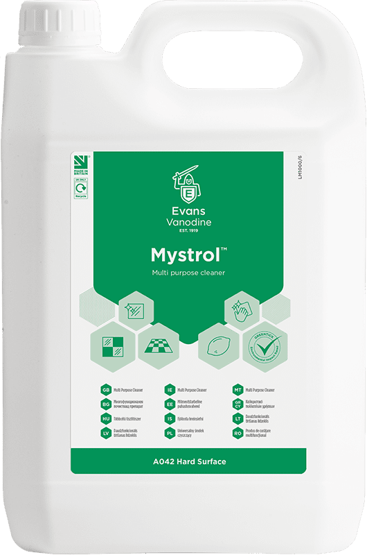 Evans Vanodine A042 Mystrol Concentrated All Purpose Cleaner is a concentrated multi purpose cleaner with a fresh lemon perfume for those tough cleaning jobs. For use on a variety of hard surfaces, including glass, vinyl, rubber, concrete & paintwork. Highly recommended for use as a carpet pre-spray treatment, and also for cleaning car interiors.