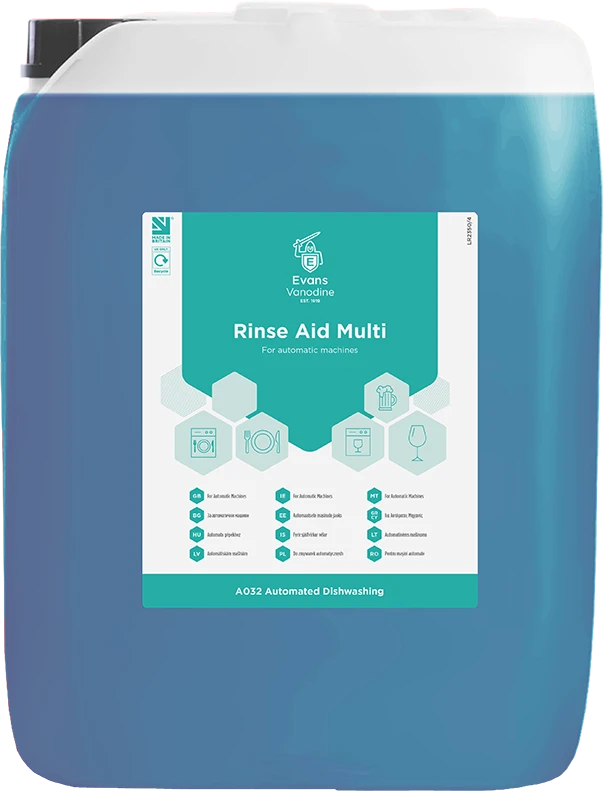 Evans Rinse Aid Multi For Automatic Machines is a blend of low foaming surfactants which promotes rapid drying of drinking glasses, it eliminates water spotting and provides a sparkling, streak free result.