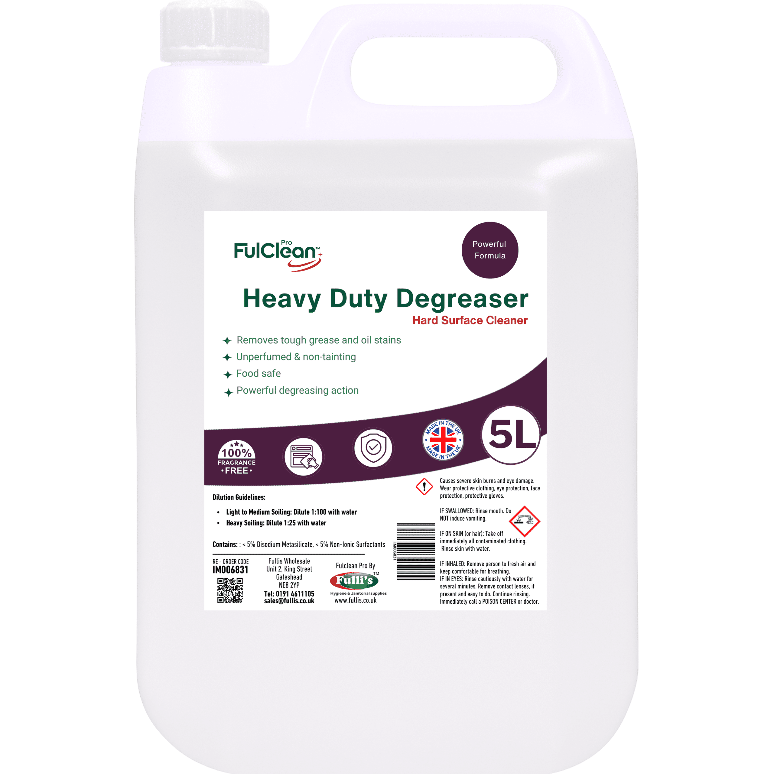 Fulclean Heavy Duty Degreaser is a powerful hard surface cleaner, ideal for removing tough grease and oil stains from most kitchen surfaces. Suitable for use in all water conditions, this formula is unperfumed and non-tainting, making it safe for use in food preparation areas.