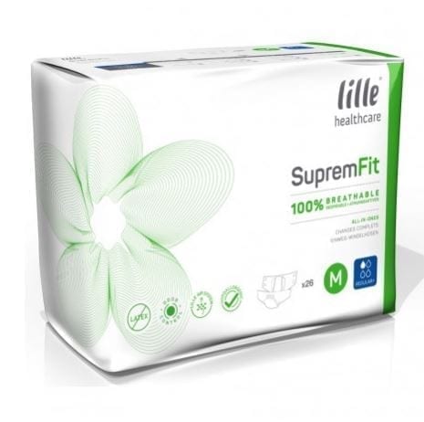 Lille Suprem Fit is a disposable all-in-one briefs for moderate to heavy urinary incontinence.The Suprem Fit has high absorption levels, anti leakage protection and optimal comfort.The Lille Suprem Fit is recommended for male and females with limited mobility who are confined to bed.HypoallergenicBreathable: YesLatex FreeAbsorbency: 2430mlPack Size: 26Quantity: 4