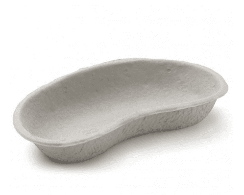 Kidney dish made of recycled and disposable pulp material with added waterproofing, manufactured in accordance with Medical Devices Directives 93/42/EEC - Class 1 as amended by Directive (2007/47/EC) and British standard PAS 29:1999 for disposable pulp products use in healthcare. High quality product with smooth outer surface and shaped to be held and carried more easily. Designed for a multitude of functions such as carrying instruments, dressings and suitable for disposal in any macerator.